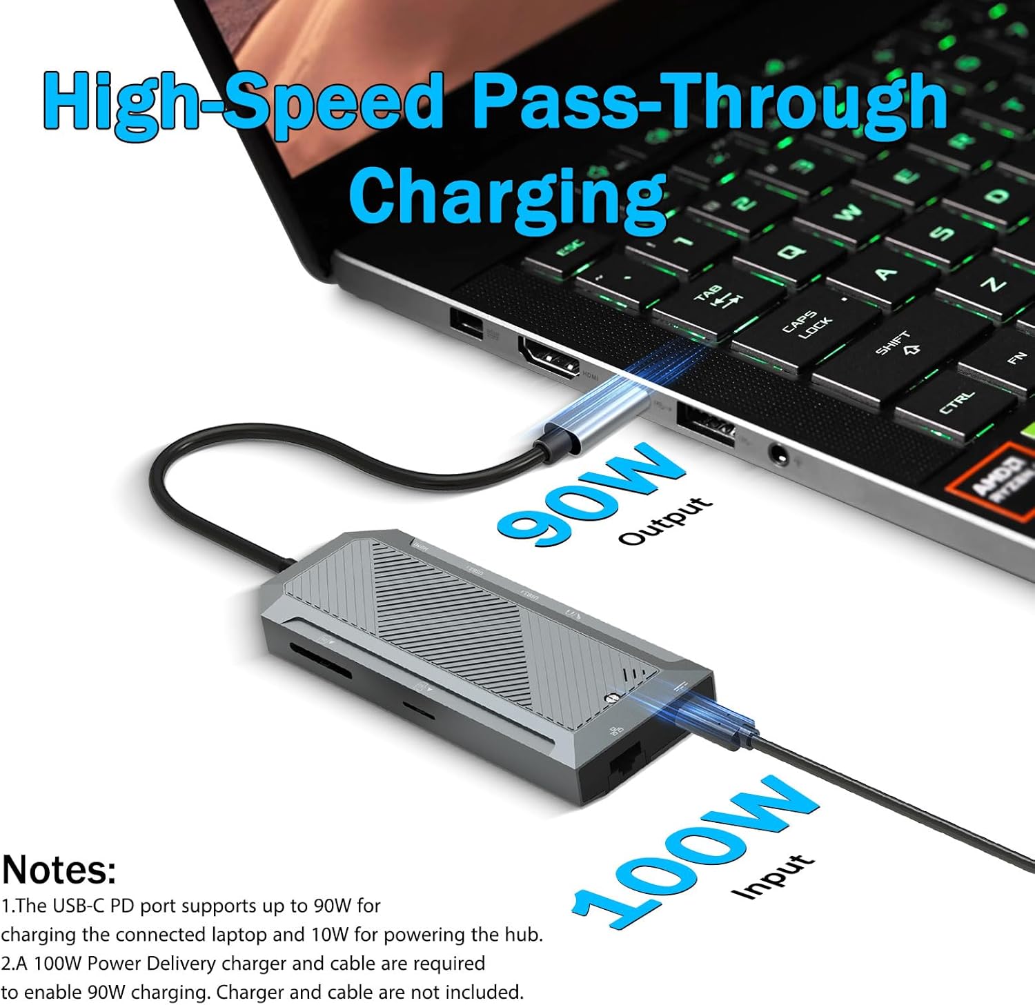 Koncentrator USB-C 9 w 1 z obudową SSD do rozdzielacza HDMI M.2 NVMe 4K 60 Hz to wielofunkcyjne urządzenie rozszerzające zaprojektowane w celu poprawy łączności laptopów, tabletów i innych urządzeń zgodnych ze standardem USB-C. Integruje dziewięć podstawowych funkcji w jednym kompaktowym urządzeniu, umożliwiając użytkownikom podłączenie wielu urządzeń peryferyjnych przy jednoczesnym zachowaniu dużej szybkości przesyłania danych i niezawodnego dostarczania energii.