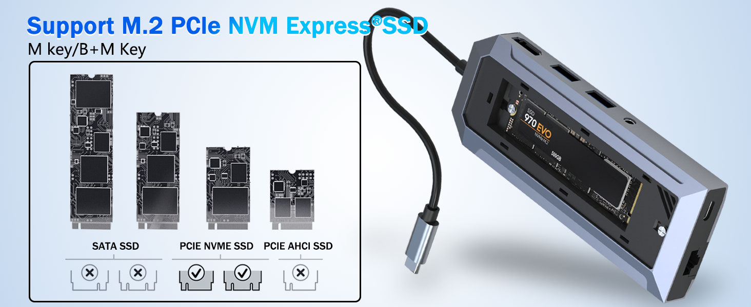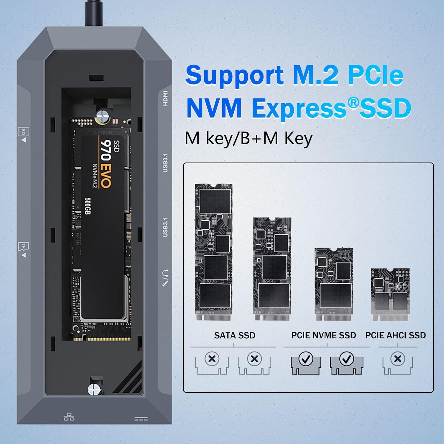 W przeciwieństwie do tradycyjnych koncentratorów USB, to urządzenie zawiera dedykowaną obudowę SSD obsługującą dyski półprzewodnikowe M.2 NVMe. Ta funkcja umożliwia użytkownikom dodanie szybkiej pamięci masowej bezpośrednio do obszaru roboczego bez konieczności stosowania oddzielnego dysku zewnętrznego.