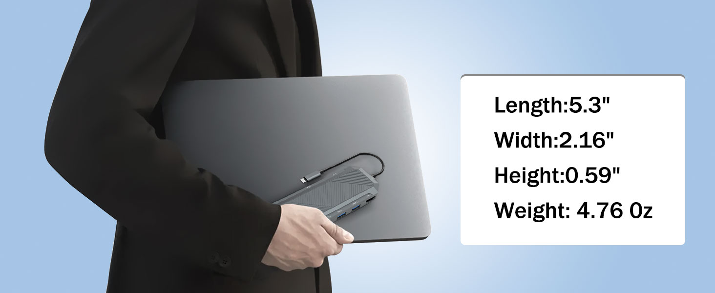 Pomimo swojej dużej funkcjonalności, koncentrator USB-C 9 w 1 z obudową SSD do rozdzielacza HDMI M.2 NVMe 4K 60 Hz został zaprojektowany tak, aby pozostał kompaktowy i lekki. Dzięki temu można go łatwo nosić w torbie na laptopa, plecaku lub torbie podróżnej.