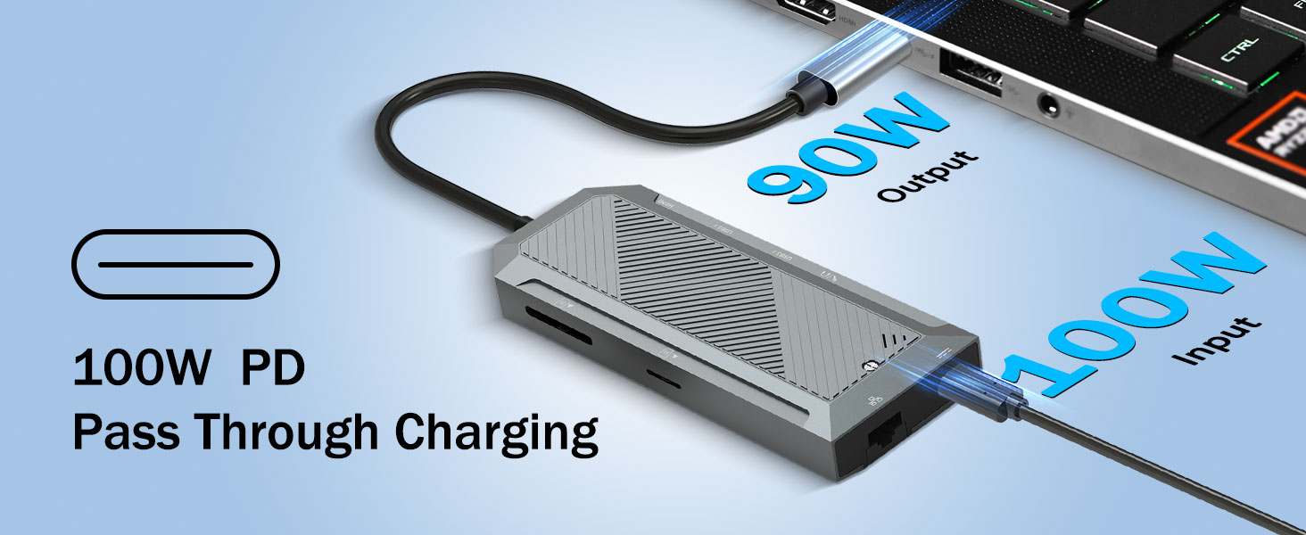 Obsługa zasilania zapewnia, że urządzenia pozostaną naładowane, gdy koncentrator będzie używany. Port USB-C PD umożliwia przesyłanie zasilania przez koncentrator do podłączonego laptopa lub tabletu.