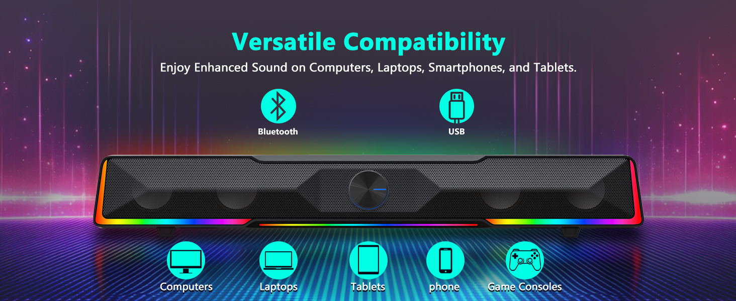 Szeroka kompatybilność urządzeń Czarny GS516 z przewodowym połączeniem Bluetooth/USB Soundbar z pokrętłem głośności Głośnik komputerowy obsługuje wiele nowoczesnych urządzeń, dzięki czemu jest wszechstronnym rozwiązaniem audio na komputerze stacjonarnym.