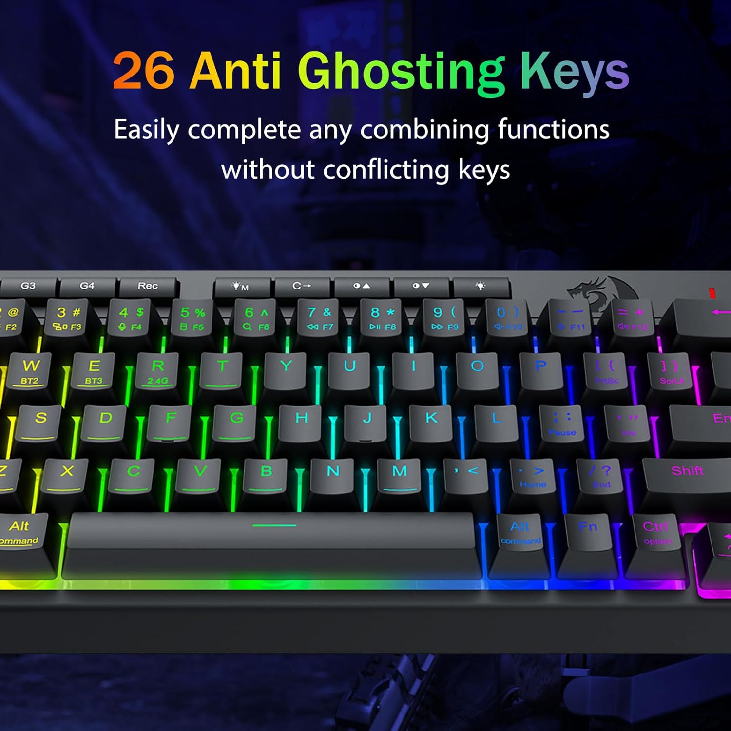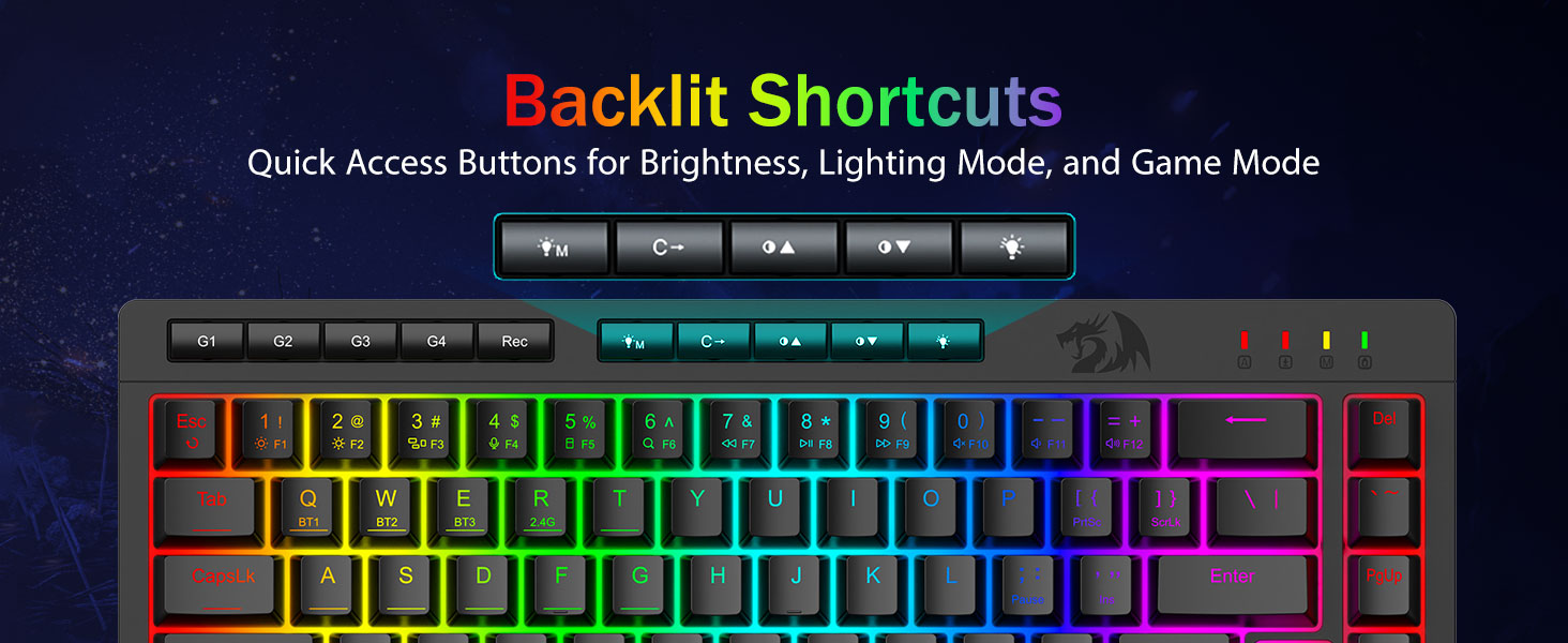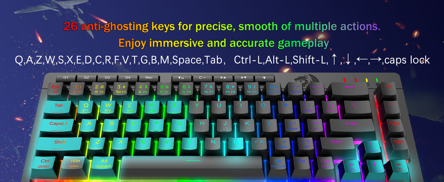 Zawiera klawisze zapobiegające efektowi duchów (klawisze z podkreśleniem), które umożliwiają równoczesną pracę 26 klawiszy, zapewniając szybkie i dokładne reakcje gry zgodnie z zamierzeniami. Przyciski szybkiego dostępu do jasności, trybu oświetlenia i trybu gry, aby szybko dostosować jasność, profile oświetlenia i włączyć tryb gry za naciśnięciem jednego przycisku.