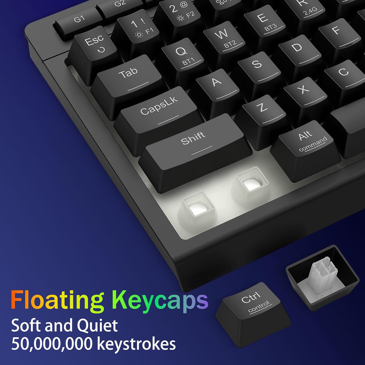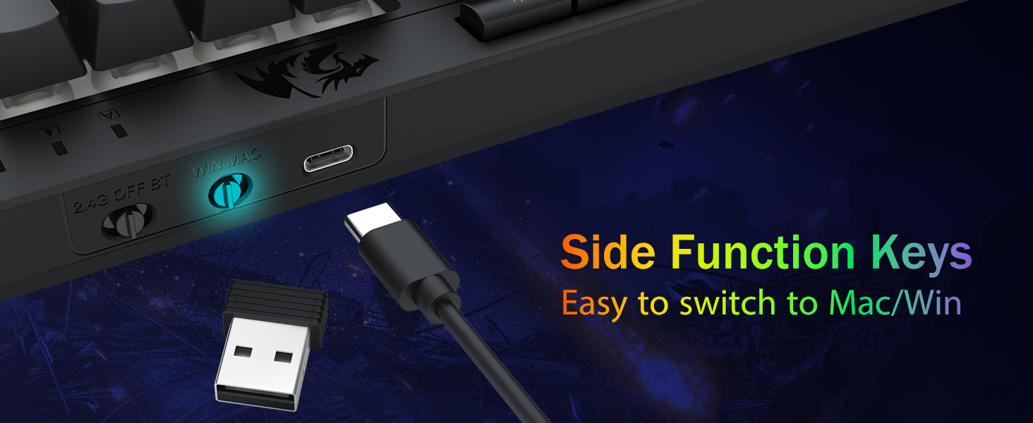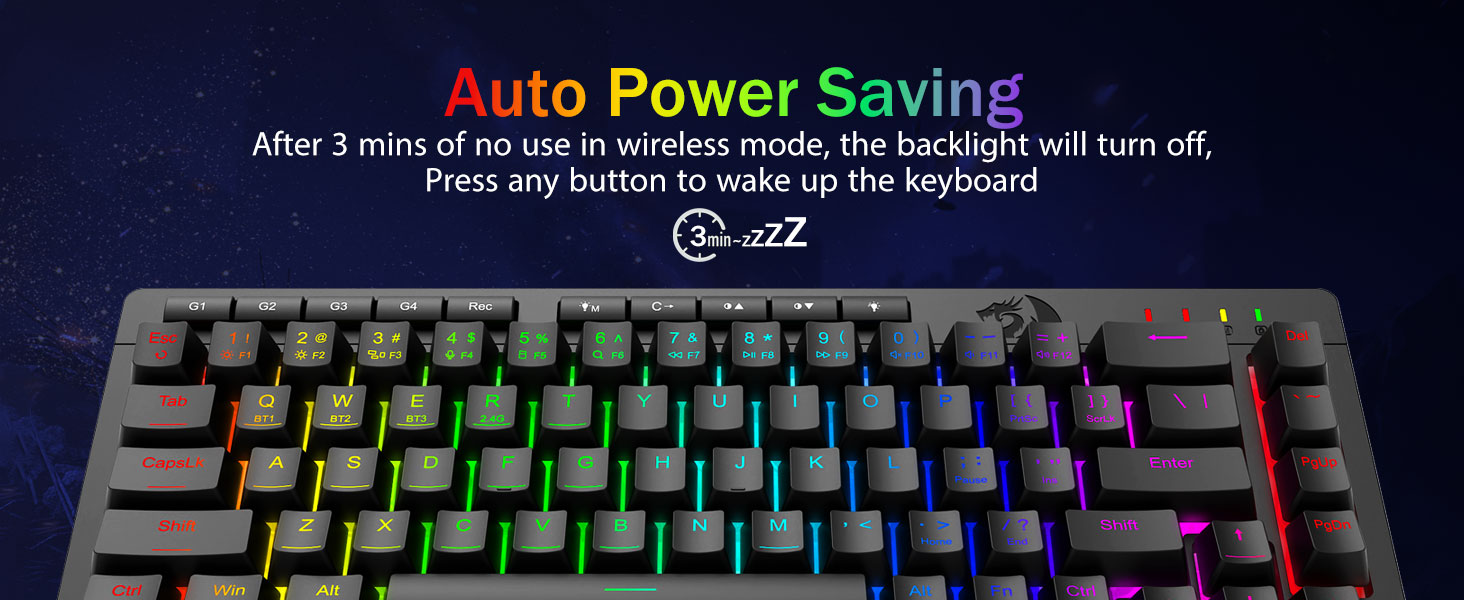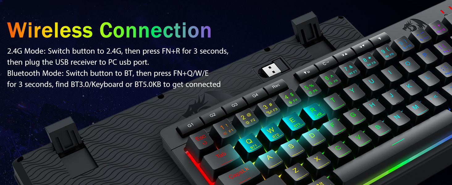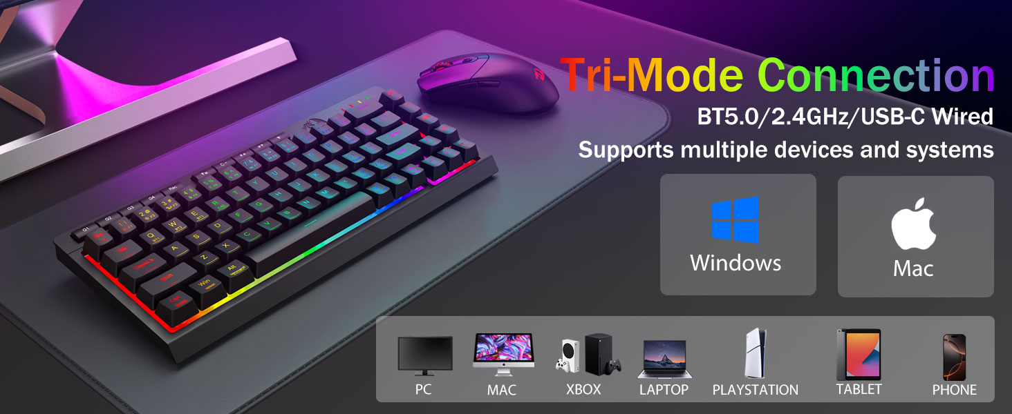 Wszechstronność w trzech trybach i doskonała obsługa wielu urządzeń —Płynnie przełączaj się między trybem Bluetooth 5.0, bezprzewodowym 2,4 GHz lub przewodowym USB-C, łącząc jednocześnie do 5 urządzeń (PC, Mac, tablety, telefony, PS/XBOX). Bezproblemowe przełączanie urządzeń za pomocą klawiszy skrótu lub przycisku bocznego — idealne rozwiązanie do hybrydowych konfiguracji do pracy i gier. Bateria o pojemności 4000 mAh zapewnia zasilanie przez wiele tygodni (ponad 30 dni w trybie czuwania, 50 godzin pracy w trybie RGB).