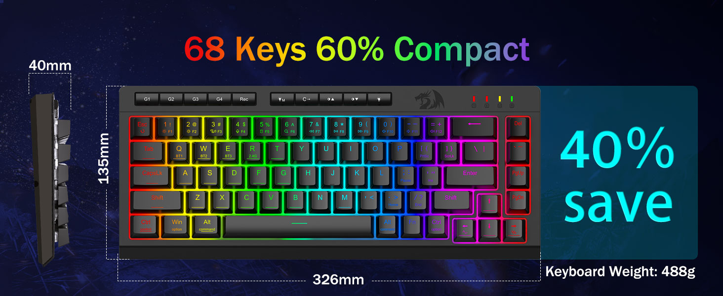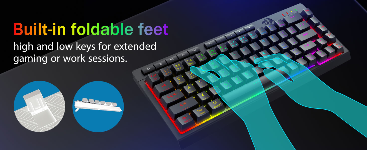 Wciągające oświetlenie RGB i konfigurowalna atmosfera —Uwolnij 16,8 miliona kolorów RGB dzięki 8 wstępnie ustawionym trybom (Rainbow Wave, Reactive Typing) + 6 profilom DIY. Dostosuj jasność od żywego blasku do trybu ukrycia — idealny do nocnych gier lub zastosowań biurowych.