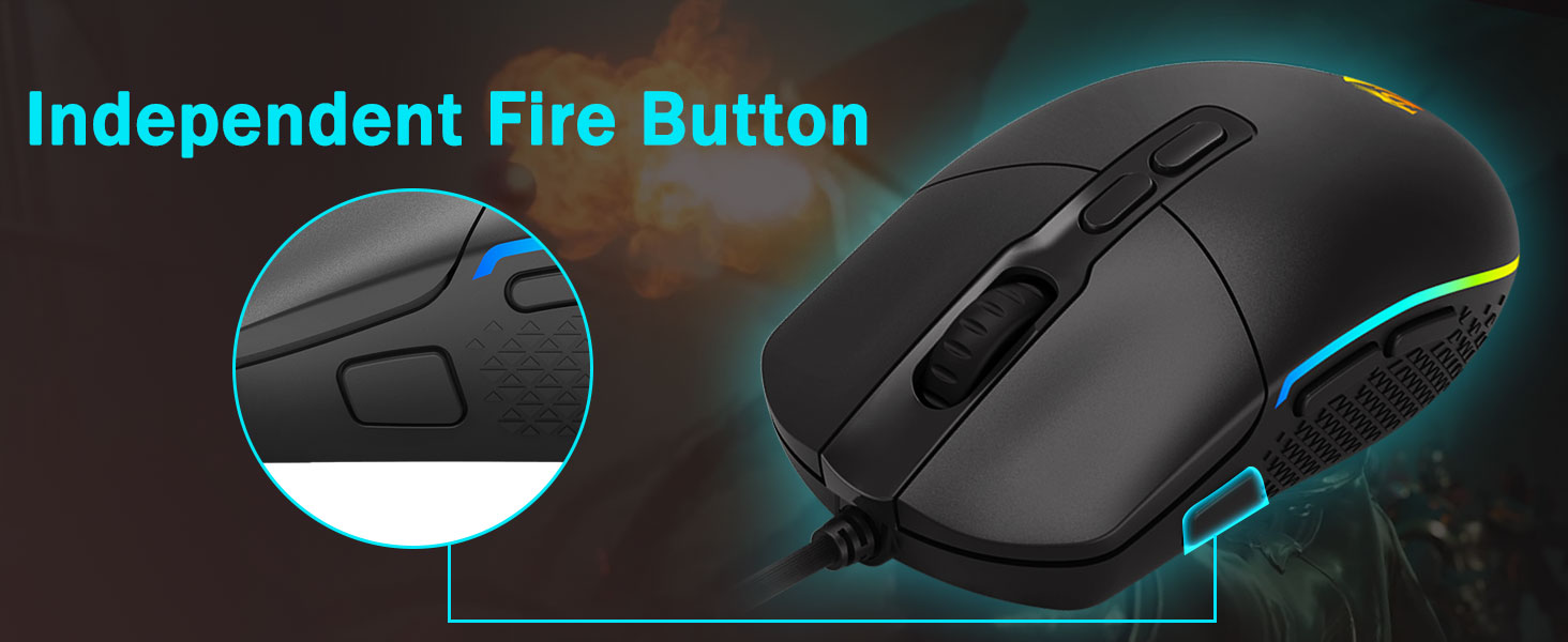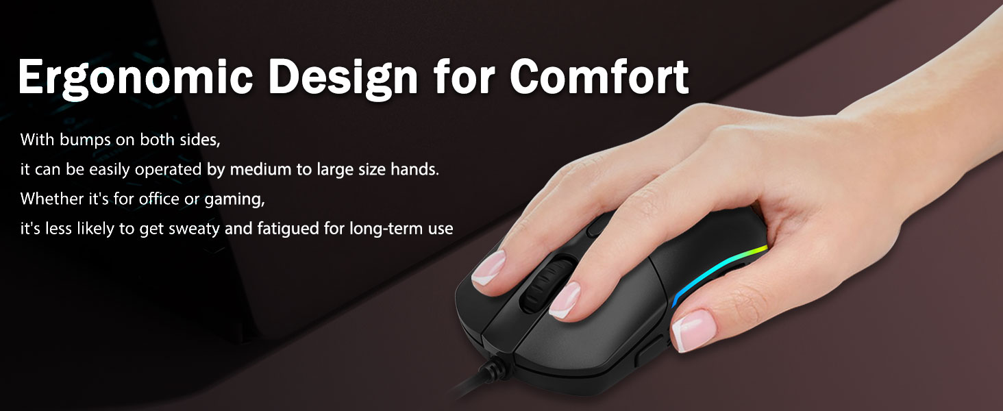 Komfortowy uchwyt- Ergonomiczne wypustki po obu stronach sprawiają, że mysz do gier pasuje do każdej dłoni. Zapewnia graczom długotrwały komfort, bez zmęczenia nawet podczas długich godzin intensywnej rozgrywki. Nie ślizga się podczas podnoszenia myszy do gier lub wykonywania szybkich i precyzyjnych ruchów.