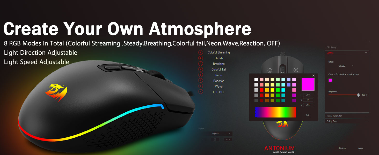 8 przyzwoitych trybów podświetlenia RGB- Włącz podświetlenie i zabij kilka wrogów na polu bitwy w grze. Hipnotyzująca, dynamiczna atmosfera podświetlenia RGB nigdy Cię nie zawiedzie podczas dekorowania przestrzeni do gier, byłoby lepiej z innymi akcesoriami Redragon z włączonymi światłami.