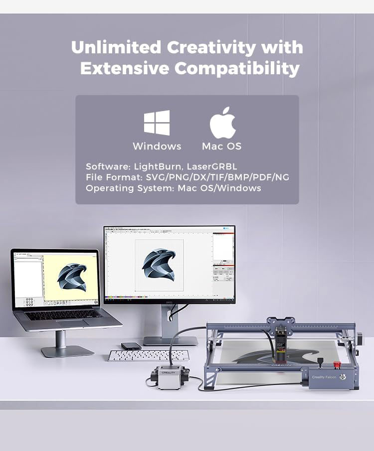 · 【Mocny i trwały ze szczegółami zgodności】Precyzję i płynność ruchu zapewniają anodowane stopy aluminium, silikonowe podkładki w kształcie litery L oraz stalowa szyna o grubości 8 mm. Wbudowana poziomica zapobiega poślizgowi i jest kalibrowana w celu ustalenia, czy sprzęt do grawerowania laserowego jest prawidłowo ustawiony. Po otrzymaniu pakietu musisz go samodzielnie zainstalować; ukończenie zajmuje około 10 minut. Grawer laserowy Creality falcon jest kompatybilny z różnymi programami do grawerowania, w tym LightBurn dla doświadczonych użytkowników lasera i LaserGRBL dla nowych użytkowników lasera.