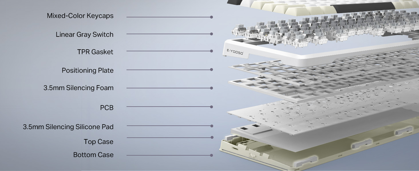 Silikonowe uszczelki lub pianka porona o wysokiej gęstości o różnych poziomach twardości zapewniają wyraźnie różne informacje zwrotne. Bardziej miękkie materiały zapewniają zauważalne amortyzację deformacji, dzięki czemu są idealne dla użytkowników szukających łagodniejszego pisania. Akustycznie ta struktura z natury tłumi echo obudowy, a po sparowaniu z podkładkami przełącznikowymi IXPE i pianką płytą poron może wyeliminować ponad 90% szumu rezonansowego, umożliwiając prześwitującą charakterystykę dźwięku natywnych przełączników.