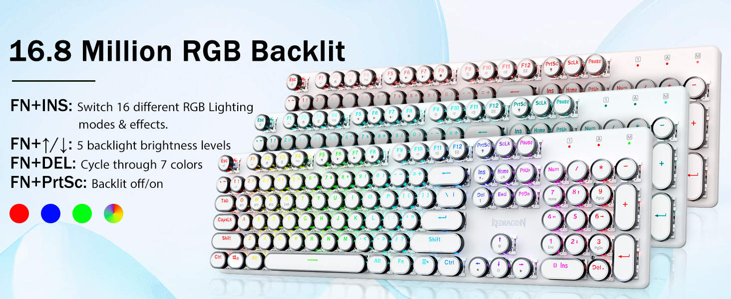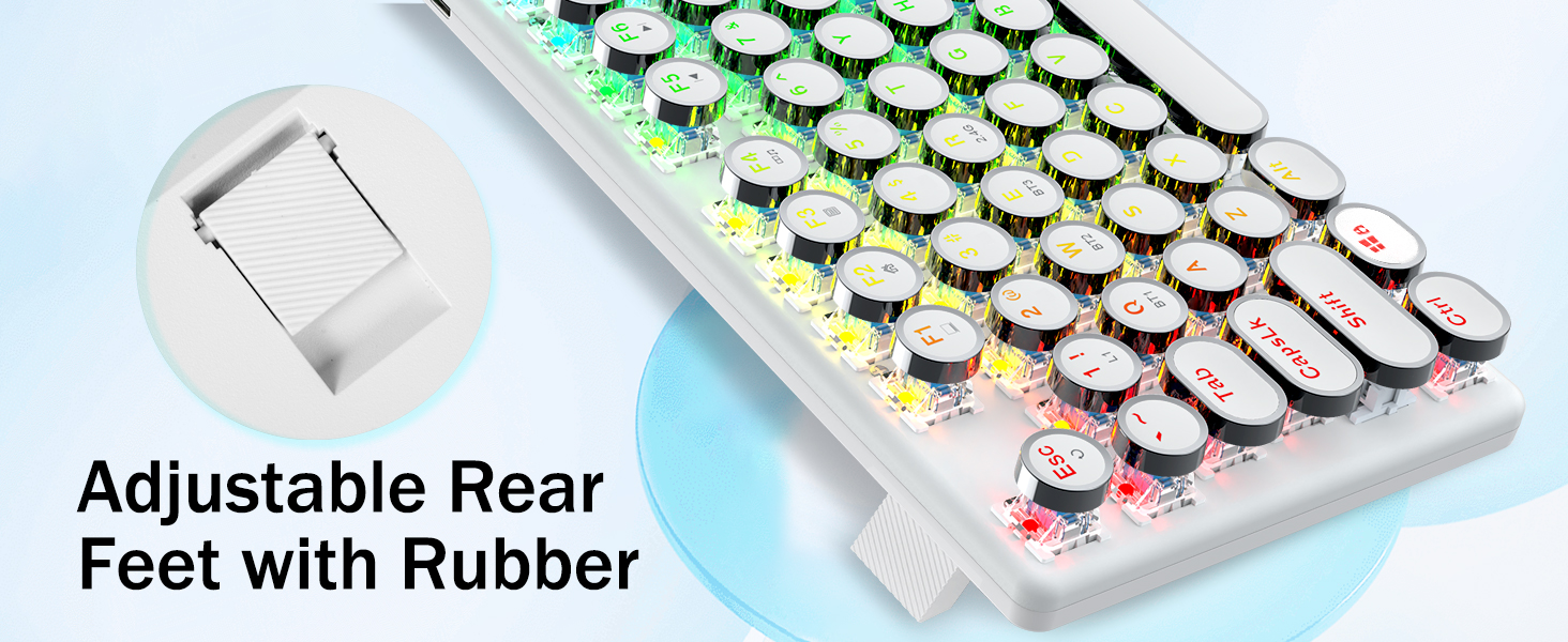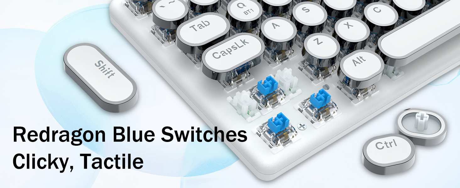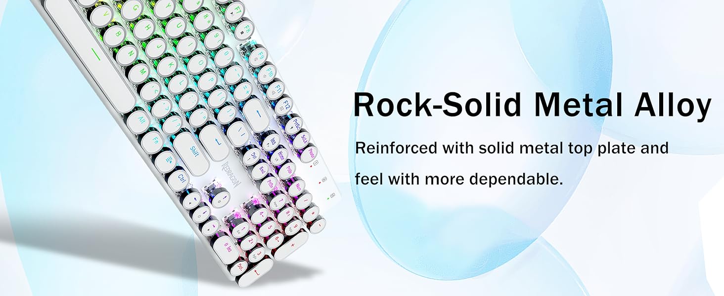 𝗥𝗲𝘁𝗿𝗼 𝗧𝘆𝗽𝗲𝘄𝗿𝗶𝘁𝗲𝗿 𝗦𝘁𝘆𝗹𝗲 𝘄𝗶𝘁𝗵 𝗠𝗲𝗰𝗵𝗮𝗻𝗶𝗰𝗮𝗹 𝗞𝗲𝘆𝘀- Niebieskie przełączniki Redragon Mechanical oferują średni opór, słyszalny dźwięk kliknięcia i dotykowe sprzężenie zwrotne, zapewniają responsywne i precyzyjne środowisko gry oraz wydajność. Okrągłe klawisze klawiatury w stylu vintage steampunk wyglądają jak klasyczna maszyna do pisania, zapewniają wygodę pisania i stabilne kliknięcie.