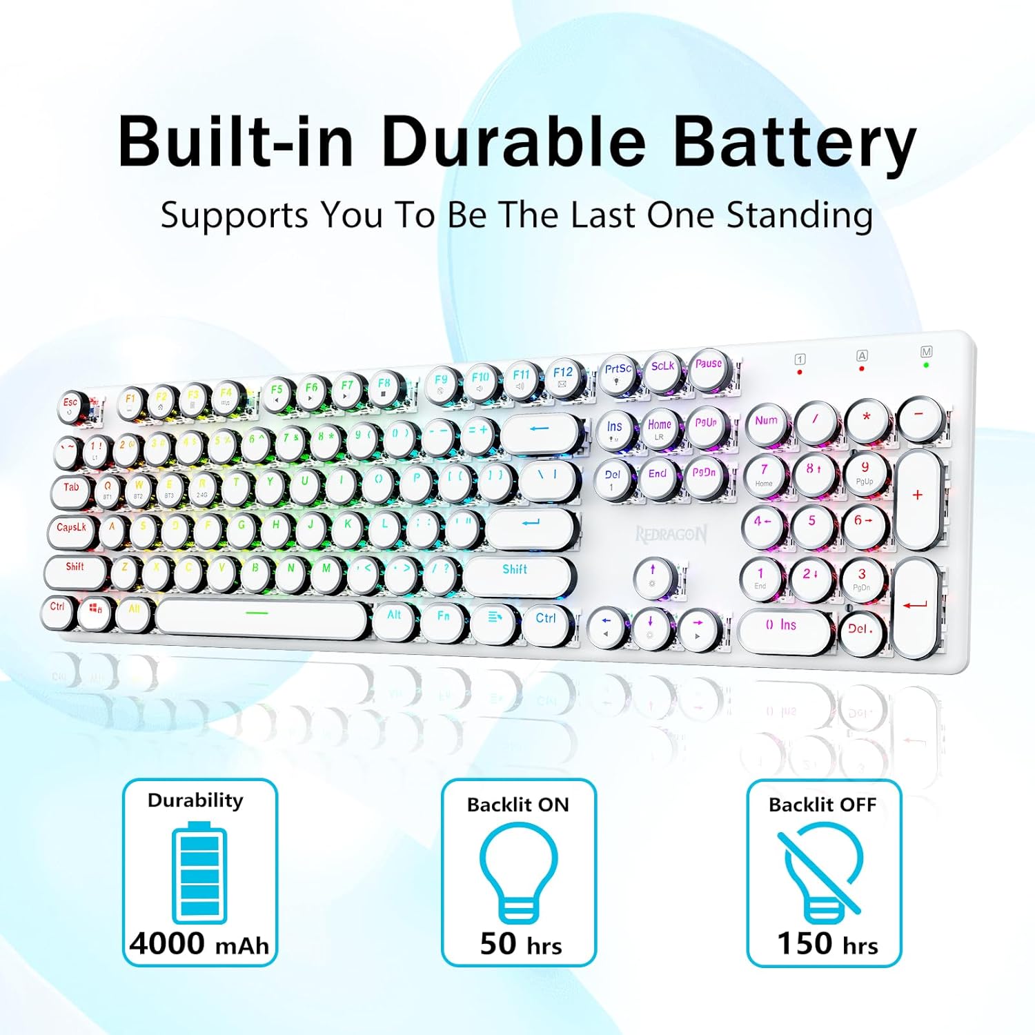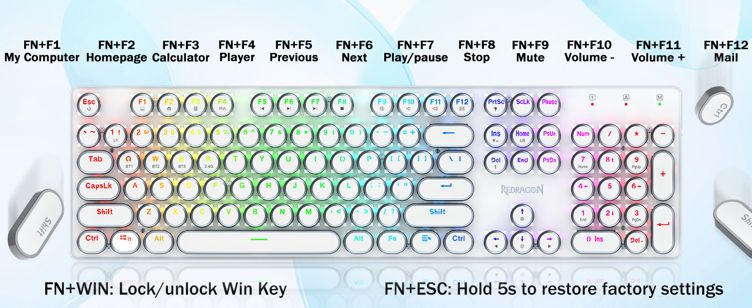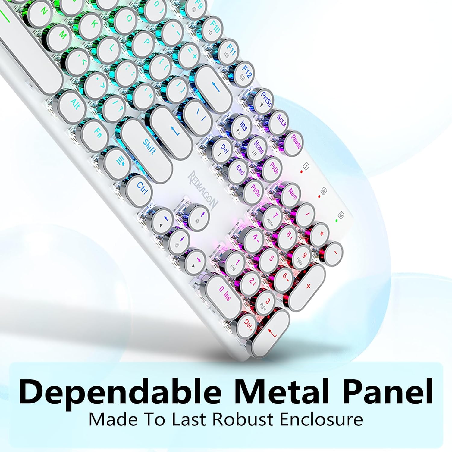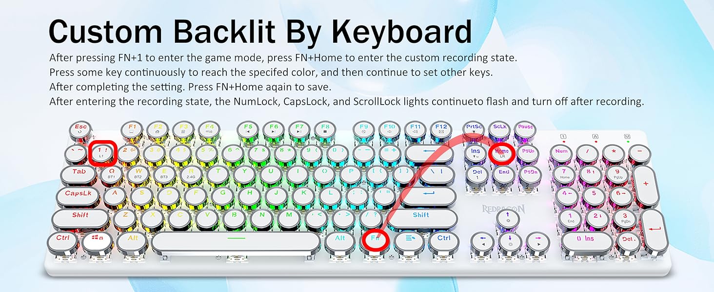 𝗥𝗲𝘁𝗿𝗼 𝗧𝘆𝗽𝗲𝘄𝗿𝗶𝘁𝗲𝗿 𝗦𝘁𝘆𝗹𝗲 𝘄𝗶𝘁𝗵 𝗠𝗲𝗰𝗵𝗮𝗻𝗶𝗰𝗮𝗹 𝗞𝗲𝘆𝘀- Niebieskie przełączniki Redragon Mechanical oferują średni opór, słyszalny dźwięk kliknięcia i dotykowe sprzężenie zwrotne, zapewniają responsywne i precyzyjne środowisko gry oraz wydajność. Okrągłe klawisze klawiatury w stylu vintage steampunk wyglądają jak klasyczna maszyna do pisania, zapewniają wygodę pisania i stabilne kliknięcie.