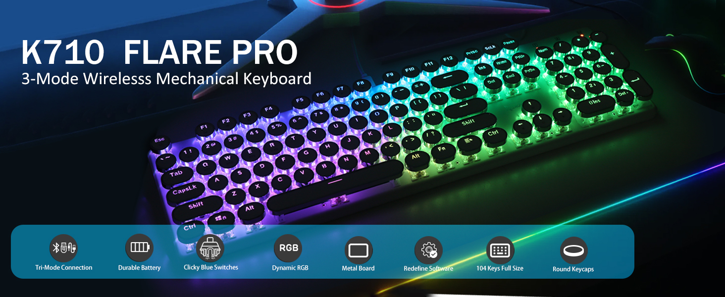 𝗗𝗲𝗽𝗲𝗻𝗱𝗮𝗯𝗹𝗲 𝗠𝗲𝘁𝗮𝗹 𝗣𝗮𝗻𝗲𝗹 & 𝟭𝟬𝟰 𝗞𝗲𝘆𝘀 𝗔𝗻𝘁𝗶 𝗚𝗵𝗼𝘀𝘁𝗶𝗻𝗴- Ulepszona wersja FLARE PRO nadal wykorzystuje ten sam, solidny, metalowy materiał. Trzymaj klawiaturę stabilnie i elegancko na biurku, aby pisać na najwyższym poziomie. Klawiatura K710 obsługuje 104-klawiszową technologię Anti-Ghosting, umożliwiającą jednoczesne naciśnięcie wielu klawiszy bez konfliktów.