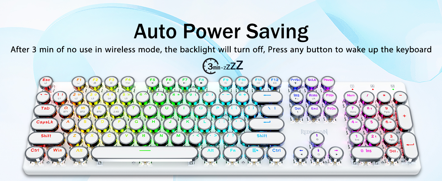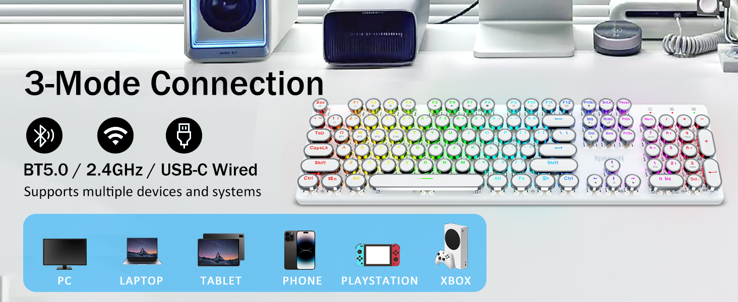 𝟯- 𝗠𝗼𝗱𝗲 𝗖𝗼𝗻𝗻𝗲𝗰𝘁𝗶𝗼𝗻- Wyposażony w innowacyjną technologię połączeń w trzech trybach Redragon, tryb przewodowy USB-C, tryby bezprzewodowe Bluetooth 3.0/5.0 i 2,4 Ghz, które sprawiają, że doświadczenie użytkownika zostaje podniesione na wyższy poziom we wszystkich dziedzinach. Naciśnij FN+Q/W/E, aby przejść do trybu Bluetooth, naciśnij FN+R, aby przejść do trybu 2,4G.